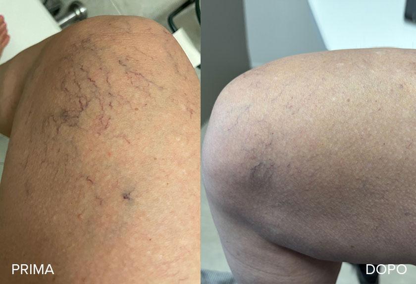 Teleangectasie: piccoli vasi sanguigni superficiali dilatati che diventano visibili sulla superficie cutanea, apparendo come sottili linee rossastre, violacee o bluastre. Comunemente chiamati “capillari rotti” (anche se tecnicamente non sono rotti ma solo dilatati), sono particolarmente visibili su viso, gambe e altre zone soggette a fragilità vascolare.